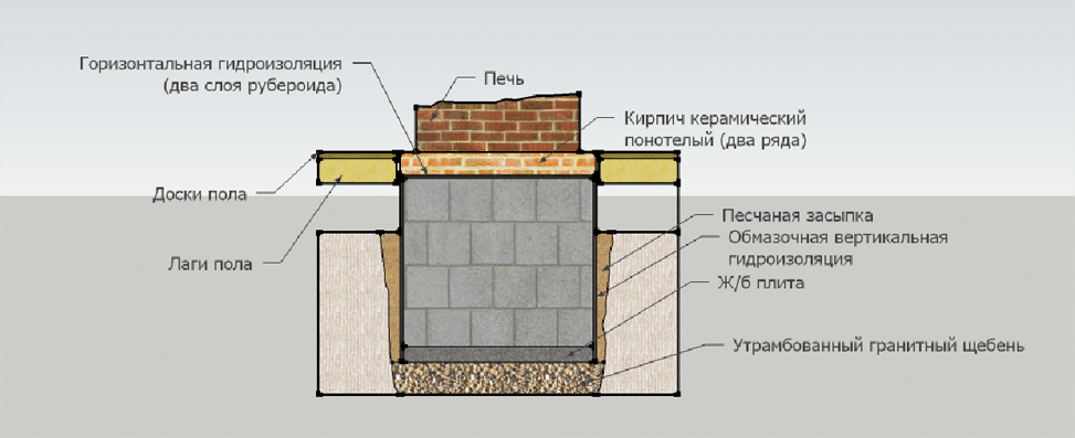 - Фундамент для голландки, как и для любого другого типа, нужно рассчитать с запасом. Ориентир – это первый слой печи, поэтому от каждой стороны добавляем до 15 сантиметров.