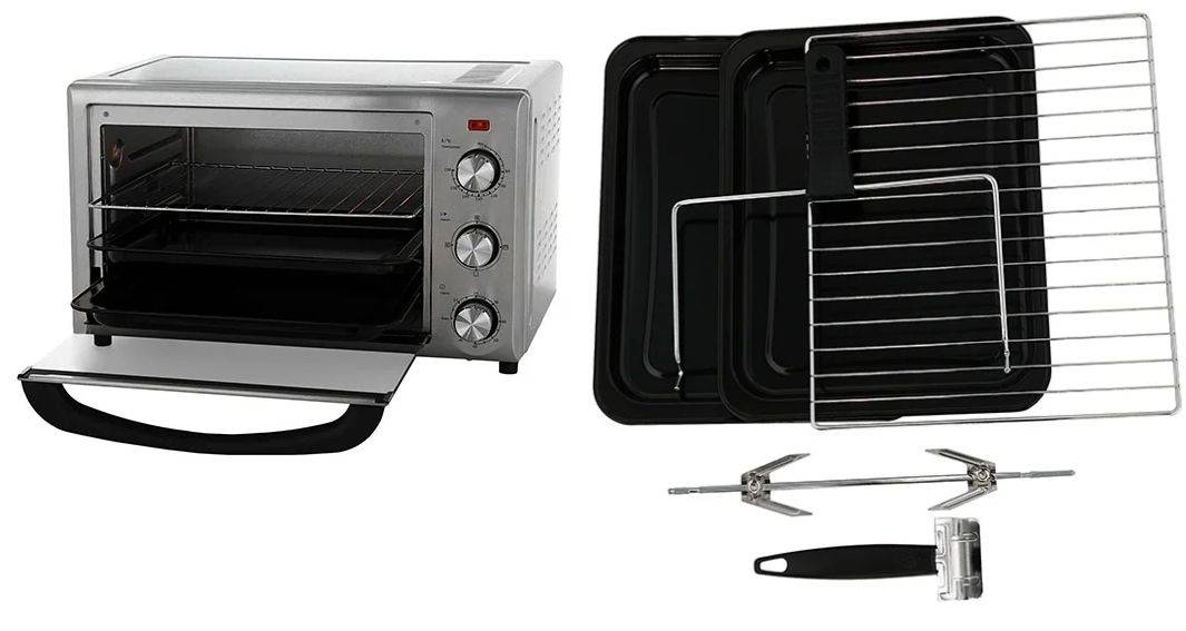 Удобно, что настольная духовка оснащена таймером (до 60 минут) — сразу установив нужное время выпекания, вам не придется следить за процессом и часами. В комплекте с прибором идет противень размером 308х251 мм, решетка и специальный держатель для их вынимания.