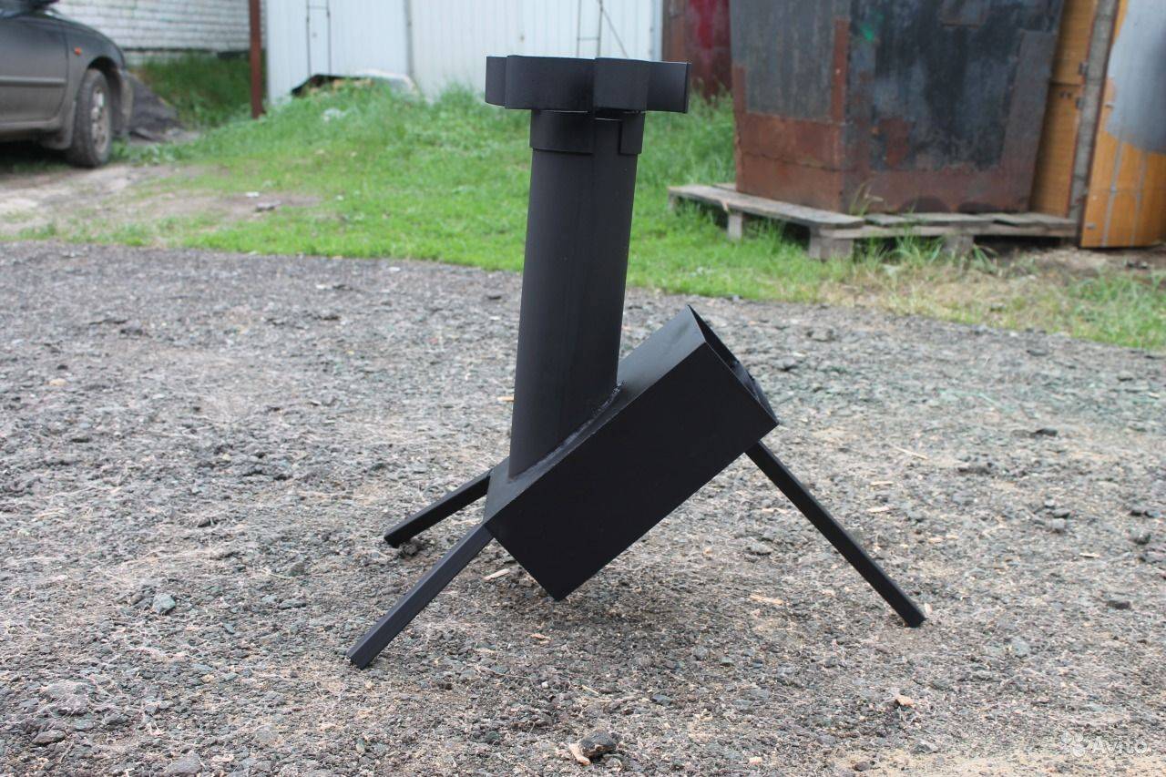 Топливо закладывается в трубу и поджигается, в результате чего появляется восходящий поток раскаленных газов, стремящийся подняться по вертикальному участку и выйти наружу. Здесь на срезе трубы и устанавливается емкость для пищи или воды. Конечно же, между кастрюлей и трубой предусматривается просвет для выхода продуктов горения. Это достигается за счет различных металлических подставок.