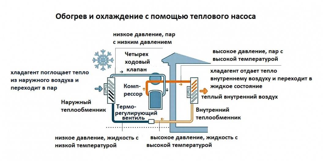 Принцип такого рода отопительных приборов аналогичен работе отопительных Сплит-систем. Воздух, имеющий температуру выше абсолютного нуля, в любом случае обладает тепловой энергией, которую такой насос отбирает у него, делая его еще более холодным на улице.