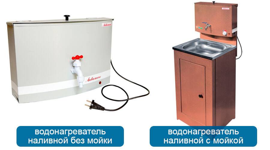 Начнем с самого простого и недорогого варианта — безнапорного наливного водонагревателя. Данный вариант идет в нескольких исполнениях — с мойкой или без мойки. Как правило, емкость идет объемом от 15 до 30 литров с тэном на 1-2 кВт.