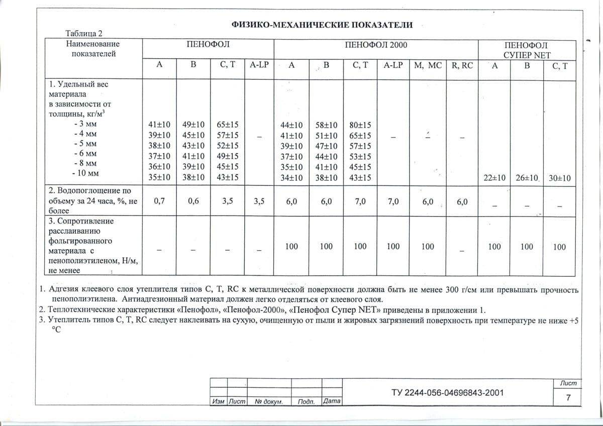 Например, рассматривая физико – механические показатели, которыми обладает пенофол, видно, что, чем меньше способность к водопоглощению, тем выше требования к содержанию влаги в материале стен дома – при оклеивании может не произойти достаточного сцепления (влаге некуда впитываться). Сопротивление расслаиванию материала также нормируется не у всех марок (см. таблицу):