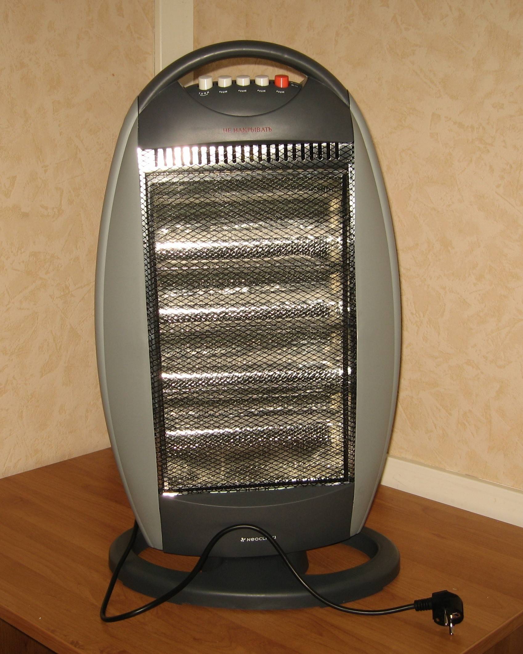 - Галогеновый. Обогреватель такого типа имеет галогеновую лампу, внутри которой находится нагревательная вольфрамовая нить, окруженная инертным газом. Она способствует выделению ИК излучения в диапазоне коротких волн. По скорости прогрева комнаты они стоят на ступеньку выше кварцевых, так как нить разогревается сильнее (свыше 2000 градусов). Сами по себе короткие волны негативно влияют на организм человека, поэтому такой тип нагревателей подойдет для кратковременного прогрева помещения. Например, их можно устанавливать для обогрева гаража, хозяйственной постройки или веранды.