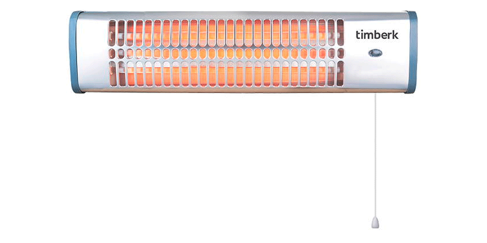 Тройку лидеров открывает Timberk T-CH1.2-A11. Компактный обогреватель с настенным креплением. У этой модели металлический надёжный корпус и классический дизайн. Три кварцевых лампы и три режима работы. Управление механическое, мощность – 1200 Вт, эффективен для помещения до 10 м². Конструкция позволяет без труда менять угол наклона обогревателя. Лампы быстро нагреваются и начинают обогревать помещение.