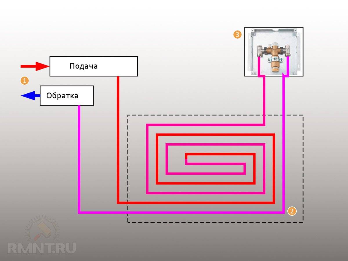 Самый простой вариант включения контура тёплого пола к радиаторной системе отопления с температурой теплоносителя 70-80 °С. 1 — магистраль с подачей и обраткой высокотемпературного контура; 2 — контур тёплого пола; 3 — унибокс. Нужно помнить, что характер работы тёплого пола может также меняться в зависимости от схемы укладки змеевика. Оптимальной считается схема «улитка», при которой трубки прокладываются парно, а значит, вся площадь обогревается почти равномерно. Если же тёплый пол устроен «змейкой» или «лабиринтом», то практически гарантировано образование более холодных и тёплых зон. Устранить этот недостаток можно, в том числе и за счёт правильной настройки.