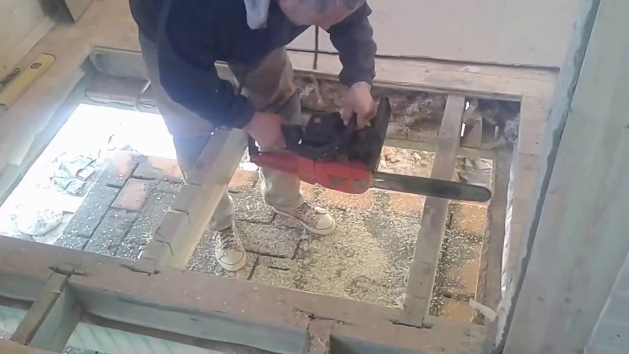 В 10-м дверцы поверху закрываются кирпичами, для чего они подпиливаются при необходимости в зависимости от формы. После завершения 11-го ряда над одной шахтой укладывается платформа плиты, а на другой шамотный кирпич укладывают только по коротким сторонам топки. После установки емкости для камней тут будут дымоходные каналы.