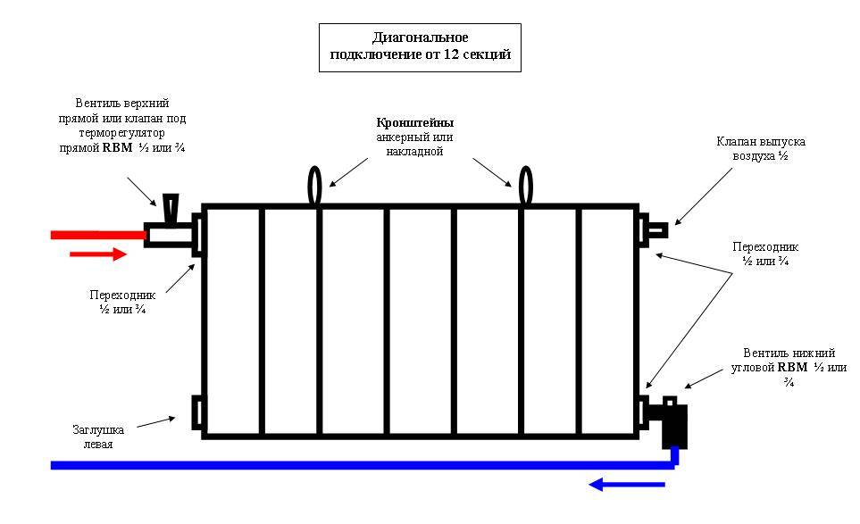 Диагональное подключение радиаторов. Труба отопления, что подает теплоноситель, в подобном варианте примыкает к верхнему патрубку, а к патрубку нижнему подсоединяется труба отводящая. Подобного рода способ правильнее и целесообразнее употреблять тогда, когда батарея отопления имеет большие размеры. При этом данный вариант подключения подойдет любому нагревающему датчику и не зависит от его размеров, ведь эффект правильного и ровного нагревания сохранится.