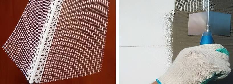 В любом случае работа почти одинаковая. На угол наносится с двух сторон полоса раствора шириной 6-7 см, толщиной 2-3 мм. Если клеите не готовый угол, а согнутые полосы сетки, то длина заполненного раствором участка должна быть на 5-7 см короче отрезанного куска (93-95 см).