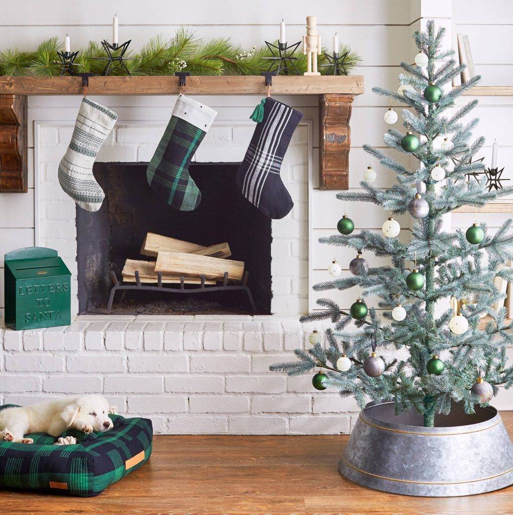 Можно остановиться на более спокойных новогодних украшениях. Мне нравится минималистичный подход как на следующем фото: только два цвета и минимум ярких элементов. Зеленые веточки ели дополнены акцентом в виде цитрусовых и шишками. Близкий к природе декор охватывает камин со всех сторон – получилось гармонично и без лишних деталей.