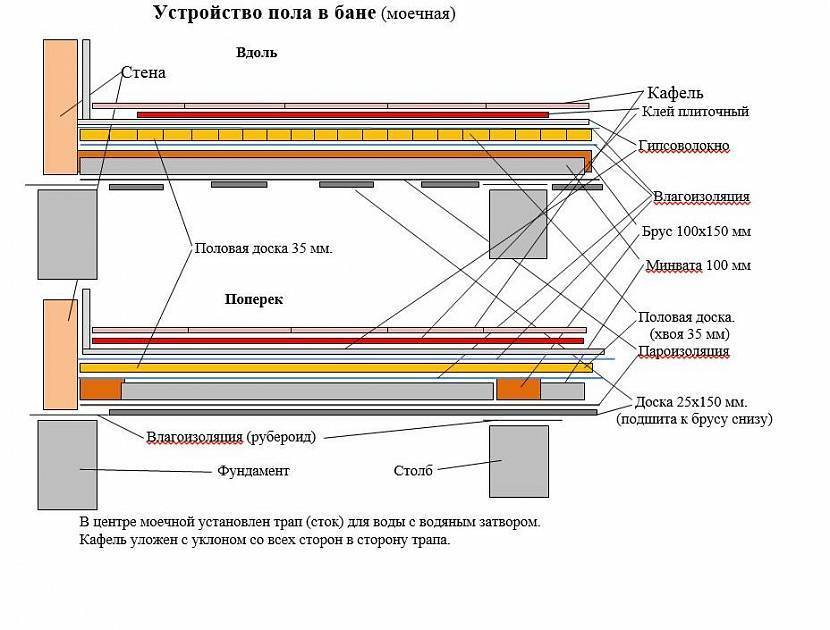 - Водосливные трапы в парилке и бане располагают вровень с полом.