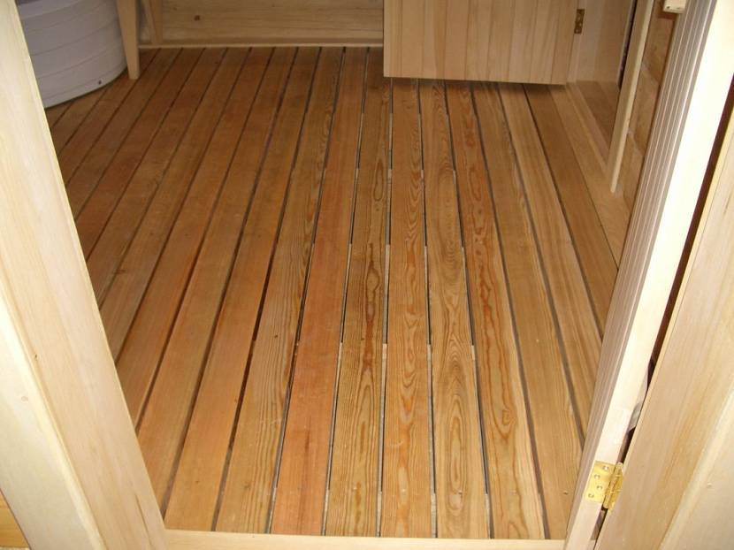 Настил в бане можно организовать двумя способами: путем создания протекающего пола, предполагающего укладку досок с зазором в 5 мм, или посредством создания наклонной поверхности.