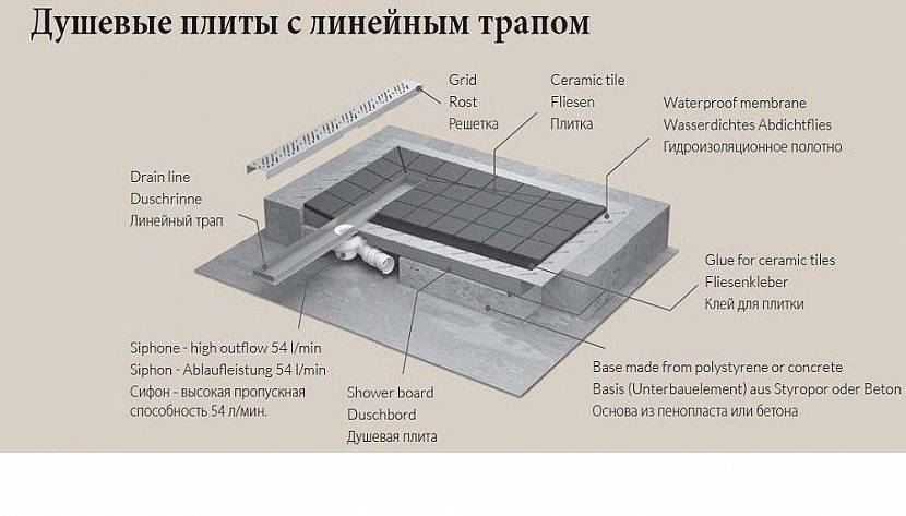 Выбирая второй способ, важно следить, чтобы при укладке финишного покрытия выдерживался уклон в сторону трапика с тем, чтобы использованная вода не скапливалась, а сразу стекала в слив