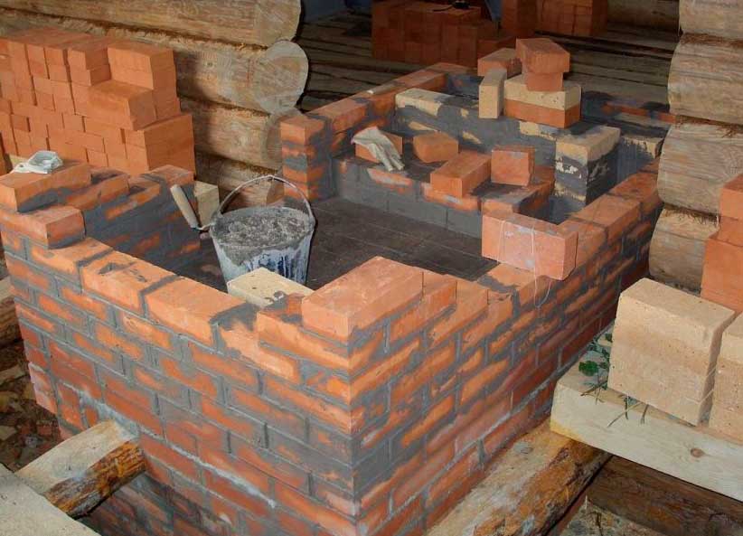 Основание кладки выполняют в косую штриховку из простого красного кирпича, на цементно-песчаный раствор. Эта часть находится под топкой и не будет испытывать высоких тепловых нагрузок. Топочную часть выкладывают из красного керамического кирпича, в сочетании с огнеупорным (шамотным) материалом. В качестве раствора используют глиняную смесь с песком (иногда с добавлением шамота).