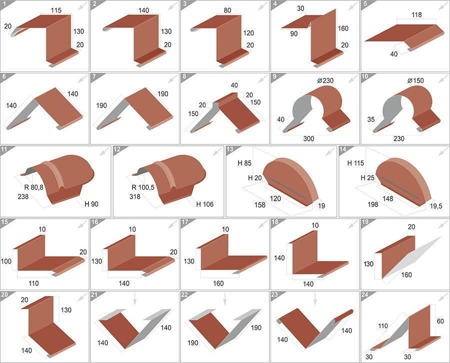 Доборные элементы для облицовки кровли изготавливают из того же материала, что и профнастил: оцинкованного металла. Защитное покрытие комплектующих тоже идентично. Оно может быть следующих видов: