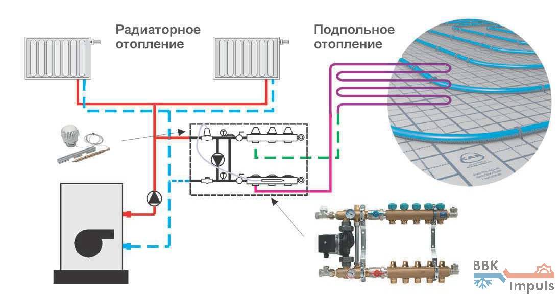 Комбинированной (смешанной) называют такую систему отопления, в которой присутствуют как традиционные высокотемпературные (обычные радиаторы, конвекторы), так и низкотемпературные (теплые полы, реже — теплые стены) нагревательные приборы.