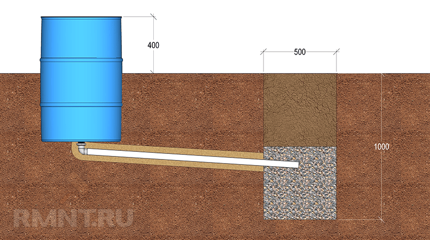 С наружной стороны «бочонка» пакуется любой пресс-фитинг или штуцер под трубу, силиконовый или резиновый шланг диаметром 32 мм и более. Он имеет небольшую длину и проложен внутри 40 мм защитной трубы из ПНД до центра поля сброса — приямка 0,5х0,5х1 метр, нижняя половина которого засыпана крупным щебнем, а верхняя — грунтом. Труба должна быть проложена ниже глубины промерзания в траншее с общим уклоном не менее 2 см на метр, защитная оболочка при этом погружается в 15 см постель песка.