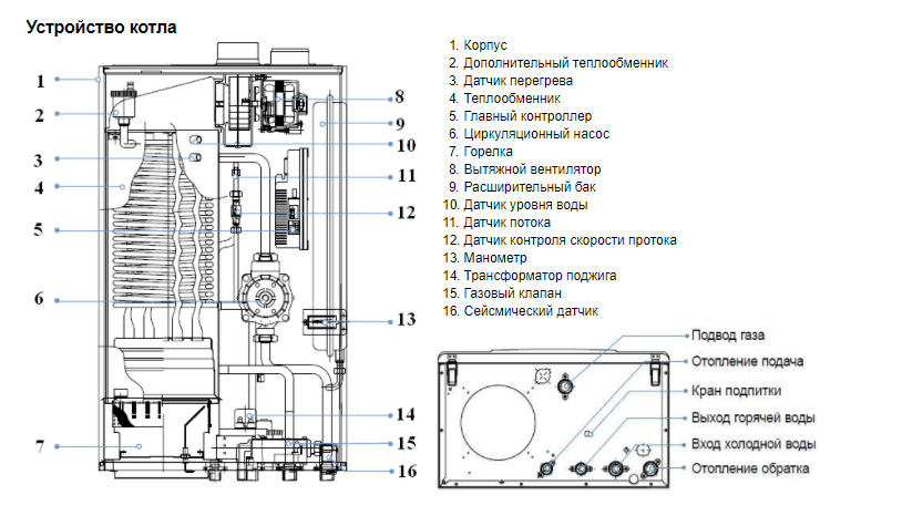 При землетрясении срабатывает датчик землетрясения, который прекращает подачу газа и обеспечивает отключение котла.
