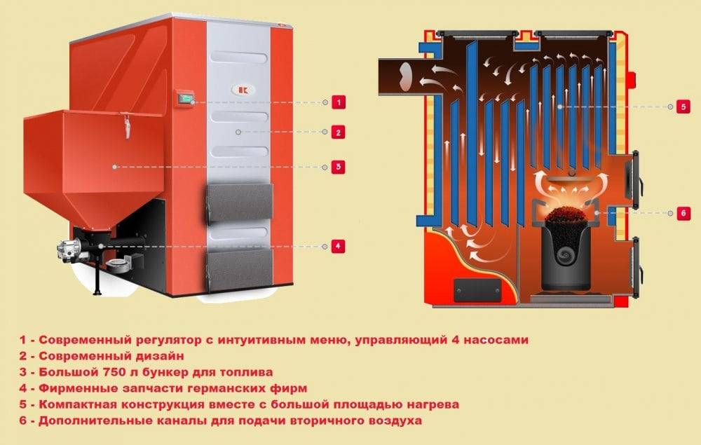 Оборудование оснащено колосниками с водяным охлаждением, системой удаления дыма с конвекционными каналами, блоком управления и вентилятором для подачи воздуха. Котлы отличаются 90‑95%-ным КПД, временем автономной работы до 48 часов, отсутствием сложной электроники, что повышает надежность агрегатов.