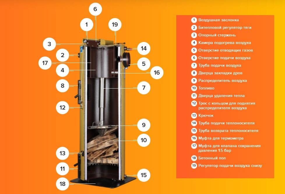 На этот внешний слой поленьев и угля, из-за встроенного распределителя, через трубу поступает тёплый воздух из специальной камеры для его нагрева. Вместе со сжиганием верхнего слоя дров данный распределитель опускается вместе с очагом горения топлива в нижнюю часть твердотопливного агрегата. Нужно сказать, что воздушный распределитель всегда находится внутри очага горения.