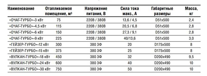 - Очаг Турбо. В этой линейке 7 модификаций с шагом мощности 1,5кВт. Мощности от 3кВт до 15кВт, длина от 350мм до 1050мм, вес от 2,5кг до 10кг.