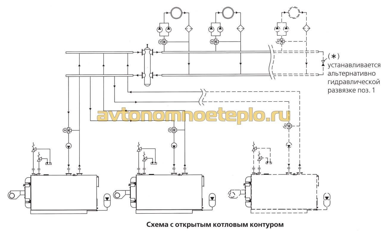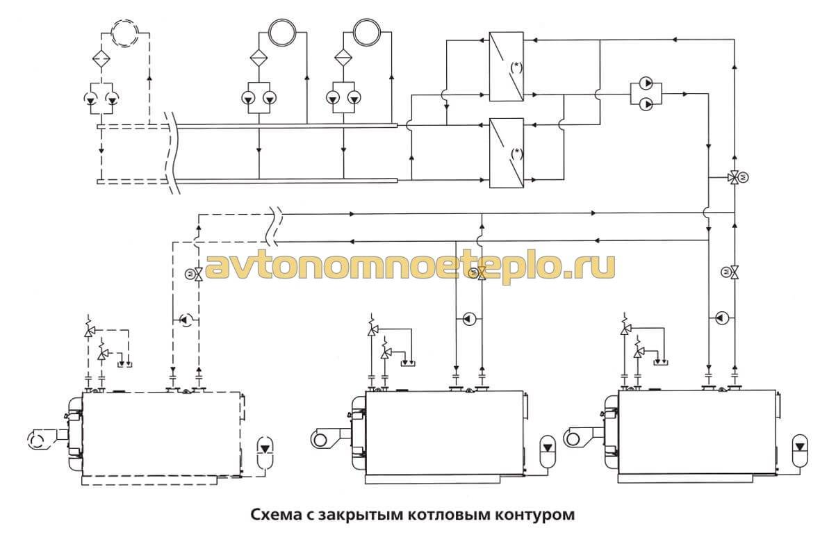 Для увеличения мощности отопления для обогрева помещений большой площади требуется одновременно подключить несколько водогрейных котлов, в таком случае они вместе смогут нагреть нужное пространство.
