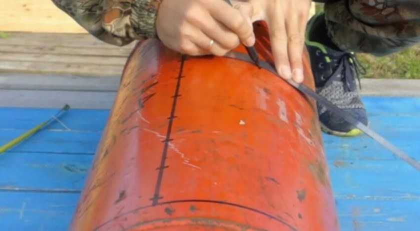 Если же вы делаете мангал-барбекю, то нужно «выкроить» и отрезать прямоугольник, который будет крышкой мангала, а вторая часть остаётся в качестве основы. Отчертите на поверхности прямоугольник из линий разреза, горизонтальные линии будут проходить примерно посередине баллона или на 5 см выше неё, а вертикальные (поперечные) на расстоянии около 20 см от его краёв.