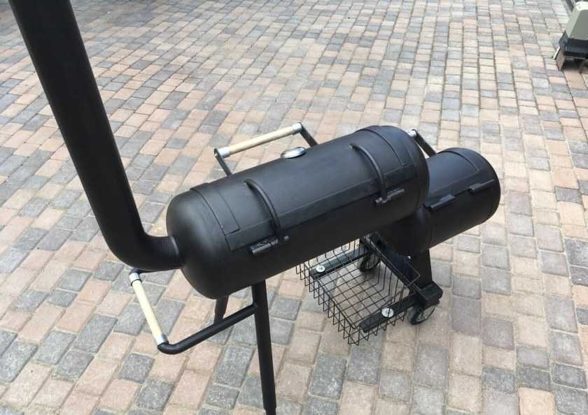Конструкция коптильни с топкой приветствует расположение двух тематических отсеков друг за другом. При этом топливник придется опустить на 20-30 см, чтобы поспособствовать лучшему копчению. К обоим отсекам привариваются по одному патрубку под крепежную трубу. Оптимальный диаметр последней – 10 см.