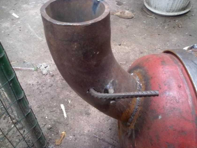 - В отверстие, на месте которого был вентиль, установите трубу для вывода дыма и приварите. Не все это делают, кто-то оставляет мангал без дымохода, особенно если планируется готовить в основном с открытой крышкой.