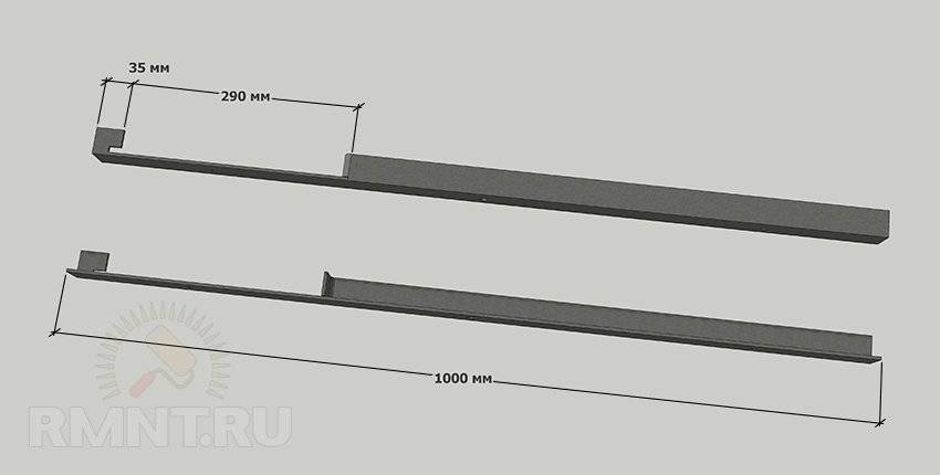 В 35 мм от верхнего края на одной из полок делается надрез на всю глубину. В этой же полке, на 250 мм ниже, выполняется второй надрез, затем они оба соединяются продольным. В нижней части пропил продолжается еще на 40 мм. Получившийся «язычок» следует загнуть внутрь уголка, выровнять, прихватить снизу сваркой и обрезать выступающие излишки.