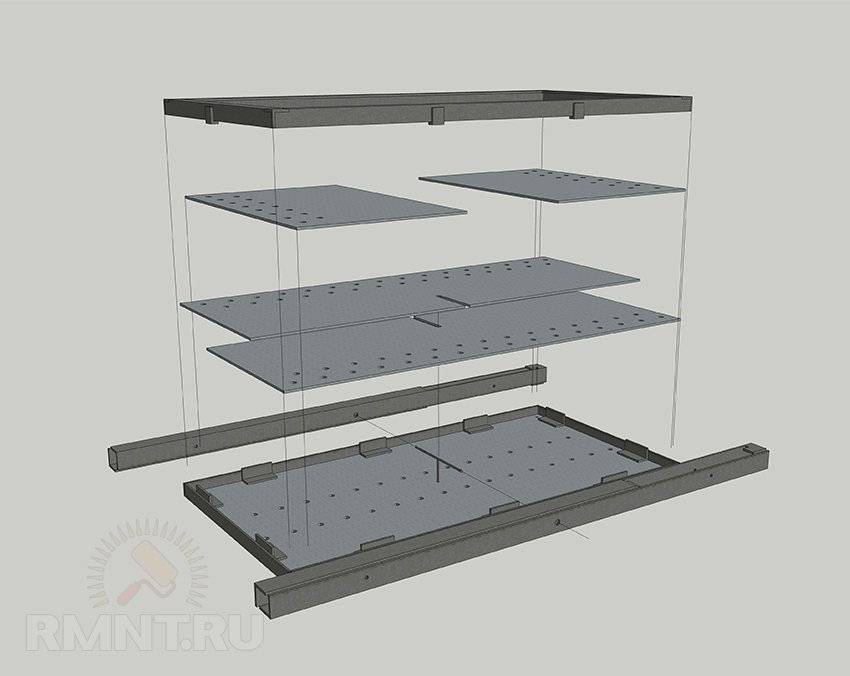 Сборка. Чтобы мангал не деформировался под действием температуры, некоторые умельцы дополнительно приваривают уголок ко внутренним краям. Он укрепляет периметр и придает большую жесткость конструкции. Кроме того, он будет служить подставкой для решетки и шампуров. Для того чтобы золу не приходилось выгребать руками, в донной части мангала высверливают отверстия. При отсутствии уголков прорези для шампуров вырезают при помощи болгарки.