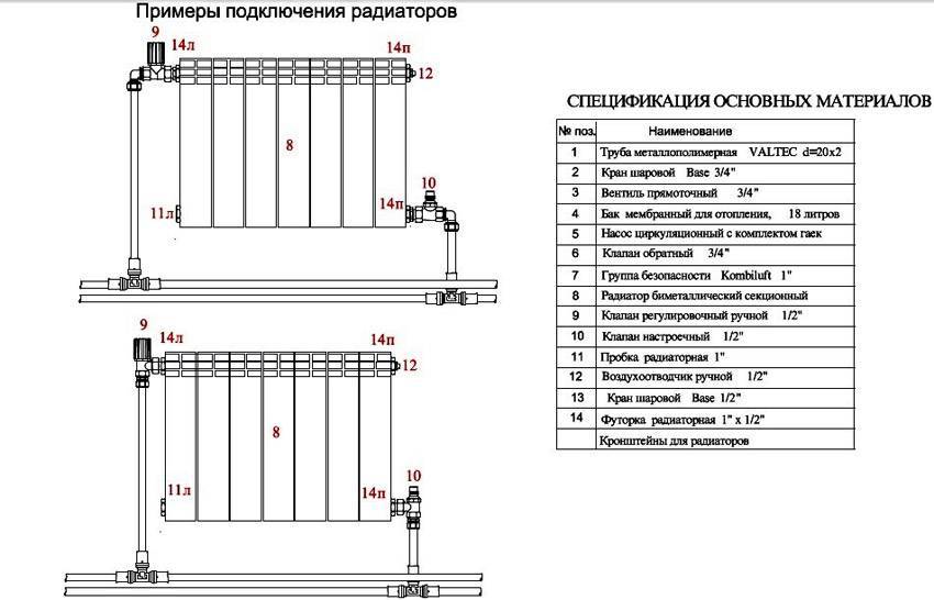 Монтаж батарей, у которых двенадцать или больше секций, осуществляется по диагональной схеме.