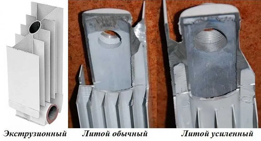 Алюминиевые радиаторы, независимо от фирм-производителей, имеют секционную структуру и 2 основных варианта конструкции – литые и экструзионные. В литых моделях каждая секция сделана отдельно, а экструзионные выполнены по технологии соединения 3-х частей, и вместо сварки отдельных секций используется склеивание или скручивание болтами.