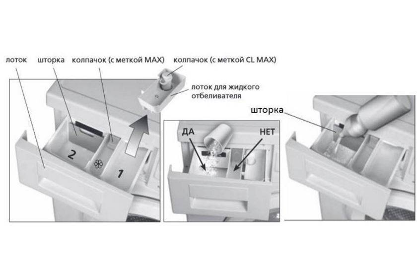 Категорически запрещается засыпать в барабан пятновыводители и отбеливатели, их используют только в специально отведённых ячейках лотка.