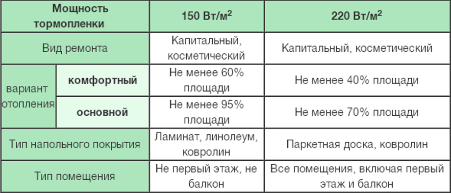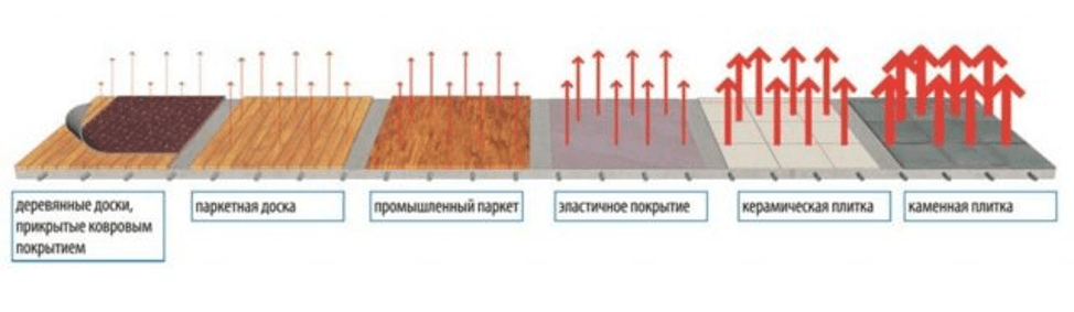 Указанные в таблице показатели – это итоговое тепловое излучение, уже прошедшее монтажный слой (стяжку, клей) и слой напольного покрытия. При этом следует учитывать, что разные материалы покрытия по-разному пропускают тепло. Кроме того, некоторые (паркет, массив дерева) плохо воспринимают нагрев свыше 26…28 градусов Цельсия.