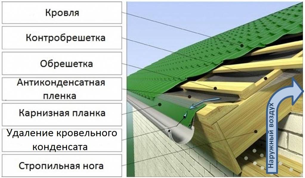 Влага из газообразного состояния переходит в жидкое, оседая в виде небольших капель. Особенно ярко этот процесс заметен, если кровельное покрытием имеет высокий коэффициент теплопроводности, к таким покрытиям относится профлист, металлочерепица, кровельная сталь.