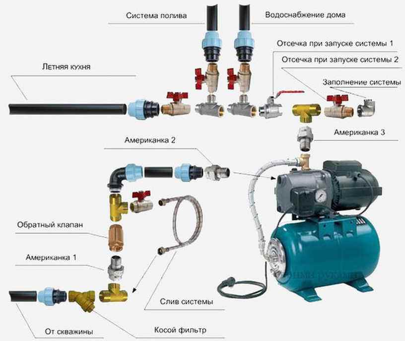 Детальная схема обвязки насосной станции при подключении к колодцу или скважине