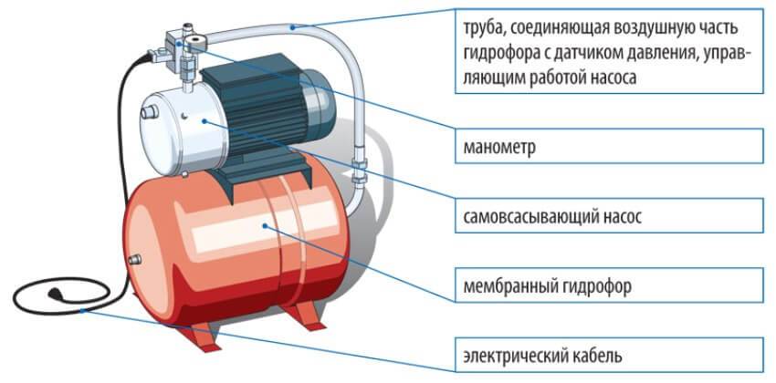 Интересующее нас насосное оборудование для водоснабжения дома представляет собой комплект из собственно насоса (центробежного, с сухим ротором), мембранного гидроаккумулятора и реле давления. Реле позволяет задать давления включения и выключения насоса (типично 1-2 и 3-4,5 кгс/см2).
