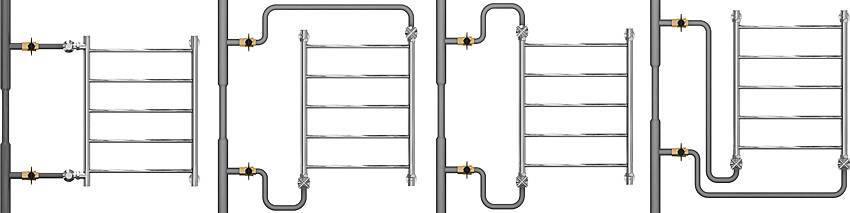 Схема подключения сушителя полотенец предусматривает его установку на трубе обратного потока горячего водоснабжения. Горячая вода постоянно должна находиться в движении, в противном случае она будет застаиваться в стояках и охлаждаться. Следствием такого застаивания является холодная вода, которая течет даже при включении крана с горячей водой. Лишь после спуска остывшей воды начинается поступление теплой воды.