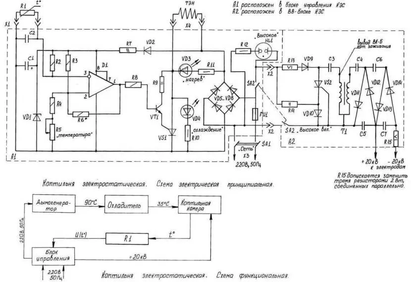 Подобная сборка обеспечит обработку максимум 10 кг продукта. Если применить ее для более габаритной коптильни, то время копчения значительно увеличится. Что касается схемы генератора высокого напряжения для электростатической коптильни, то вполне работоспособных великое множество. Самая популярная представлена ниже.