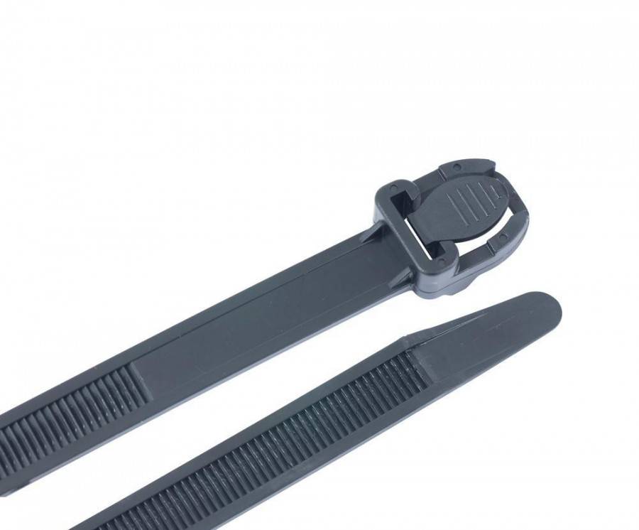 Если для снятия одноразовых приспособлений вам придется разрезать полоску, то многоразовый пластиковый хомут имеет открывающийся замок. Благодаря ему появляется возможность повторно производить крепление. Встречаются в продаже и хомуты с анкерным механизмом крепления, а также выпускаются полоски в виде шариков с шильдиковым элементом и без него.