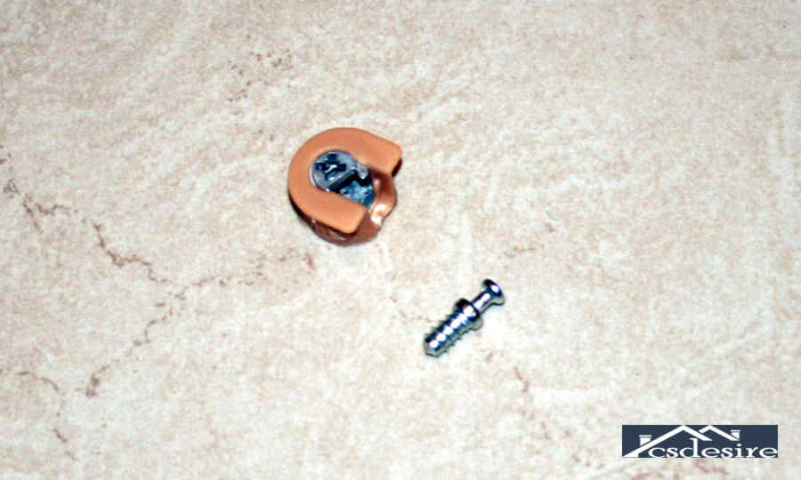 Самый распространенный вид крепежа это конфирмат. Одновременно самый простой в использовании. С его помощью собрать мебель проще и быстрее, чем с применением других видов мебельной стяжки. Особенно если во время сборки предстоит самостоятельно сверлить отверстия под крепеж. С помощью конфирмата соединяют две детали под углом 90 градусов.