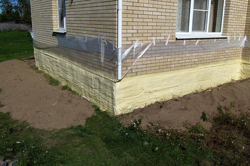 Вначале здание окапывают на глубину 50-60 см. Стены очищают от земли и просушивают. На дно образовавшейся траншеи засыпают песок. После этого напыляют ППУ на всю поверхность фундамента, захватывая примерно полметра выше уровня земли. Подсохшую пену обрезают и оштукатуривают. Можно вместо штукатурки использовать специальные отделочные плиты. Полимер, оказавшийся выше уровня земли, отделывают облицовкой.