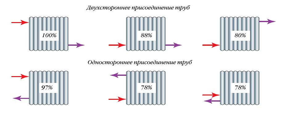 - Верхнее или нижнее. Подача теплоносителя в верхнюю часть батареи, при отводе через нижнюю, оказывает минимальное влияние на теплопередачу. Подача снизу вверх снижает показатель на 20-22%.