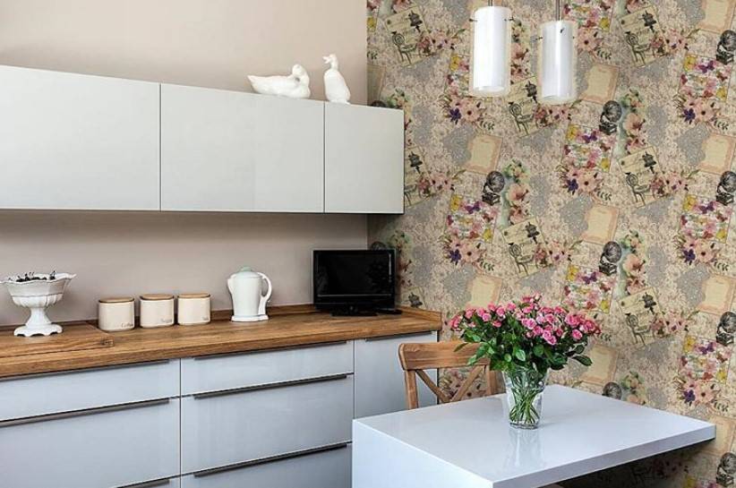 цвет и рисунок обоев на стенах. Обои для маленькой кухни следует выбирать светлых оттенков и без ярких цветовых пятен