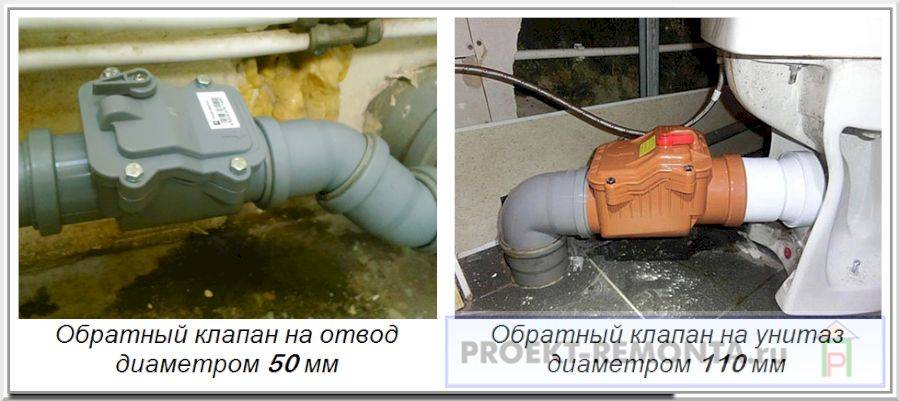 - Если места возле стояка для централизованной арматуры нет, то придется ставить отдельно обратный клапан для канализации 50 мм на отвод в сторону ванной, кухни и т.д. И затвор диаметром 100 – 110 мм на унитаз.