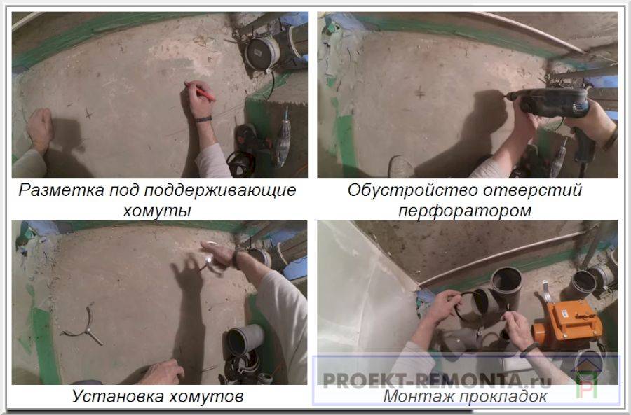 Теперь вам остается только соединить систему с канализационным сливом и жестко зафиксировать ее на металлических хомутах.