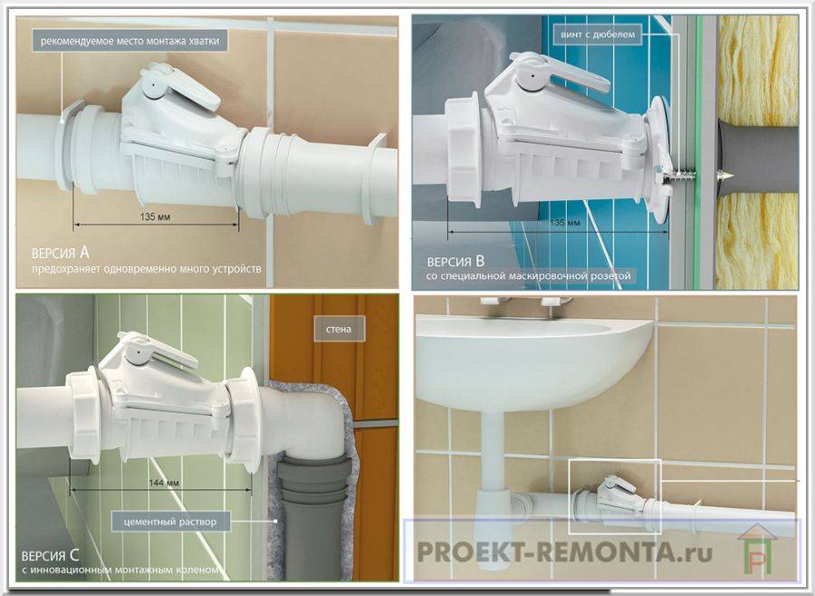 - Канализационный клапан в квартире лучше всего ставить на тройник или крестовину возле центрального слива в стояк.