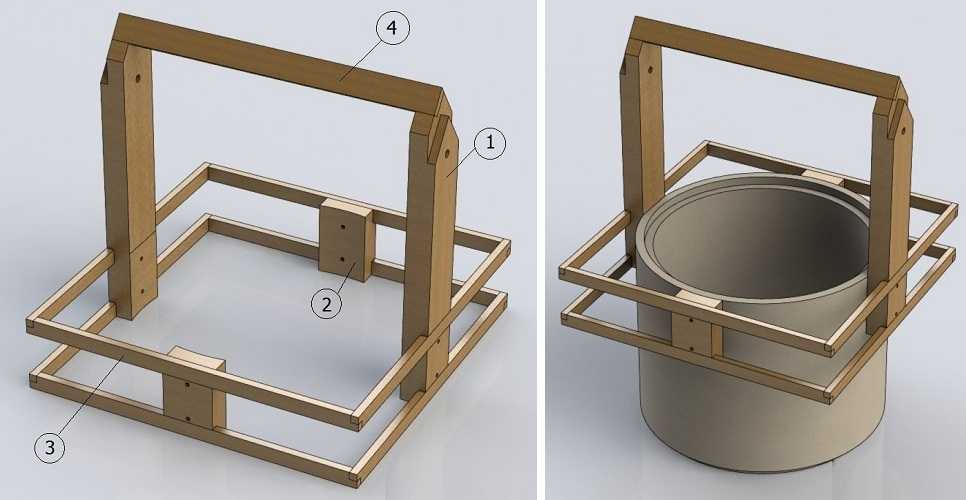 В зависимости от выбранной ранее техники рытья, бетонные детали конструкции монтируют по-разному. При единовременном монтаже всех частей используют специальную треногу. Их опускают в подготовленную шахту, скрепляя водоупорным цементным раствором. В завершение дополнительно соединяют скобами.