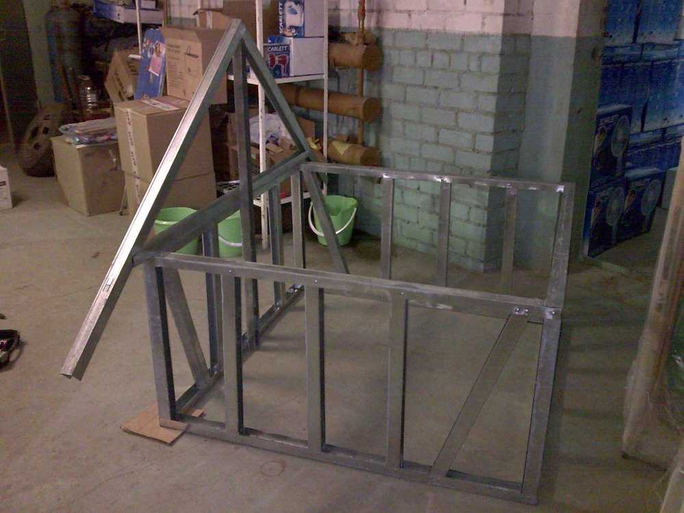 Профиля берем из толстого металла, оцинкованные. Из направляющего собираем две одинаковых рамы — «пол» и верхний уровень кольца. Соединяются они стойками (профиль для стоек). Получился куб с заполненными боковинами.