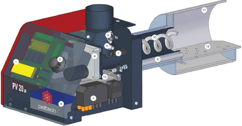 Устройство пеллетной горелки, где 1 – ЖК-дисплей, 2 – ручка управления, 3 – резервный аккумулятор, 4 – разъем соединительный, 5 – датчик уровня топлива, 6 – предохранительное термореле, 7 – фотодатчик, 8 – двигатель внутреннего шнека, 9 – запальник, 10 – шнек внутренний, топка, 11 – решетка сгорания, 13 – вентилятор